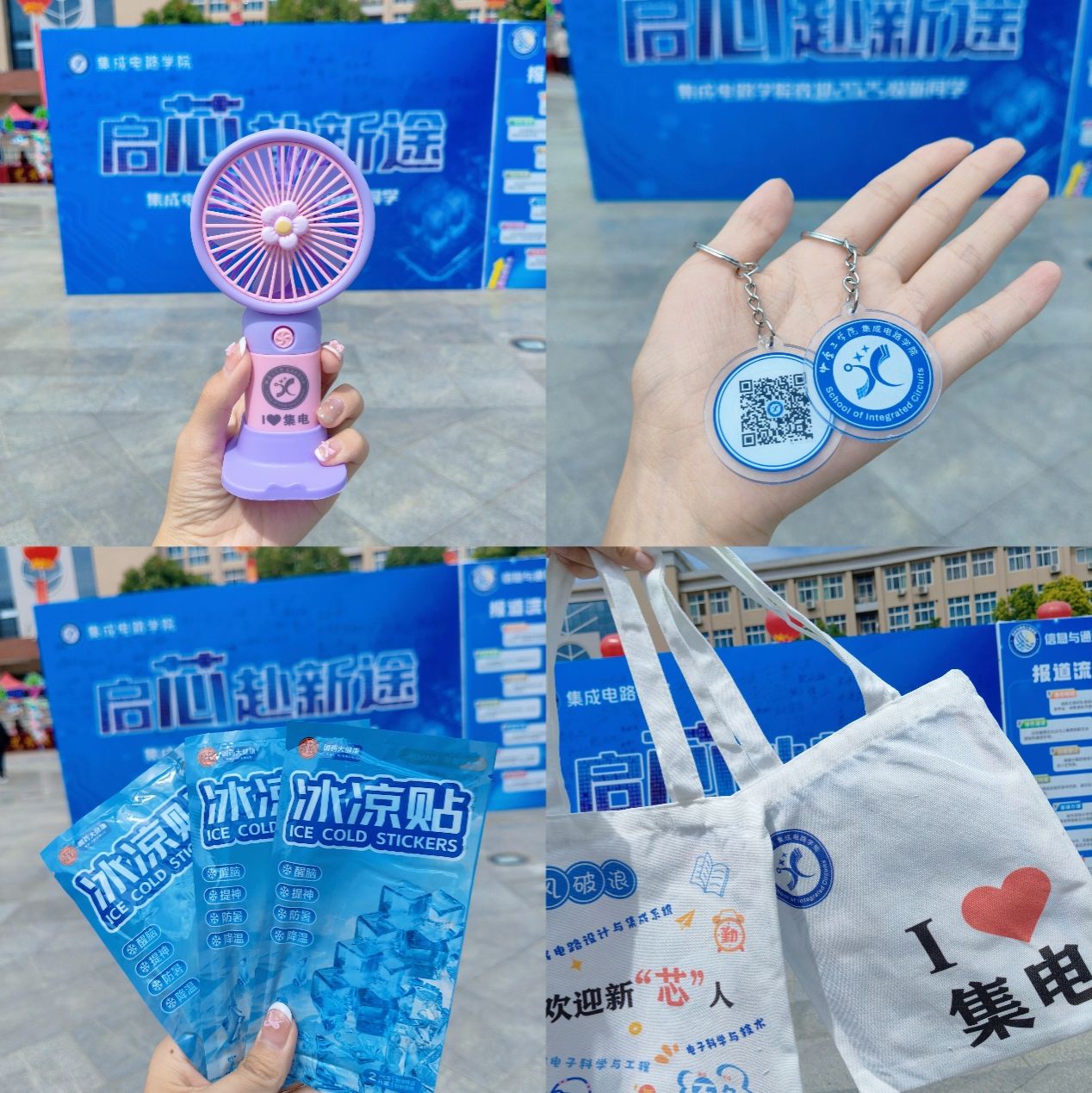 学院为新生精心准备了实用又贴心的迎新定制礼袋,内含定制帆布袋、手持小风扇、钥匙扣和清凉贴等物品,上面印有学院标识与“欢迎新‘芯’人”等字样,既彰显集成电路特色,又为新生带来便捷与关怀,陪伴他们凉爽启程、自信开启大学新生活!