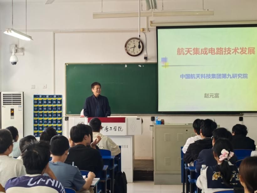 学院院长马建国特邀中国航天科技集团第九研究院技术首席赵元富教授和中国航天科技集团第五研究院首席研究员曹桂兴为2025级新生讲授“开学第一课”。赵元富教授从航天集成电路系统的特殊要求切入,详细阐释了太空辐射环境对集成电路的严峻挑战。通过具体案例,生动说明了抗辐射加固技术在保障航天器可靠运行中的关键作用,并以中国在抗辐射设计和先进封装领域取得的多项重大技术突破为例,深入剖析了芯片的特殊技术要求和前沿发展趋势。