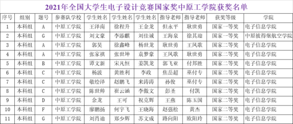 12月19日,2021年全国大学生电子设计竞赛颁奖大会在西安召开,我校电子信息学院和中原彼得堡航空学院代表学校参赛并取得优异成绩,共获得国家一等奖2项、二等奖9项,河南省一等奖10项、二等奖11项及三等奖23项,我校获国家奖总数实现了新突破,综合成绩持续保持河南省本科组第一名。本次竞赛我校共组织94只队伍、282名学生参赛(其中电子信息学院75队,中原彼得堡航空学院19队),是河南赛区参赛最多的院校,参赛题目涵盖了本科组的所有题目(A-G题),是至今我校参赛题目最全的一次。